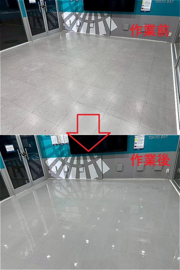 2026/04/10 Webからのお客様です みなさん、こんにちは! 2か月ぶりの更新になってしまいました。 今回はWebからの新規ご依頼で商業施設の床清掃依頼です。 お客様がいない夜間の作業となりました。 日中たくさんのお客様がいらっしゃってるので以前かけたワックスも薄くなり、汚れが目立って いましたが、しっかり洗浄してワックスを塗布し床本来の輝きを取り戻しました。
