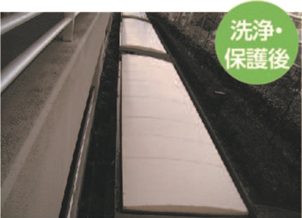 MOS保護剤は躯体内部に皮膜となって定着することで、経年劣化・接触での剥離によってムラになりません。また、経年でシリコンが劣化し、撥水効果が自然に失われることで、次回洗浄時に剥離作業の必要がありません。